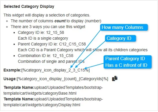 Usage: [%category_icon_display_{columns}_{CategoryIds}%]